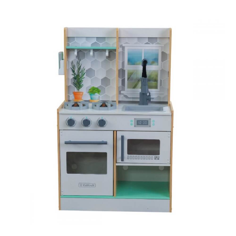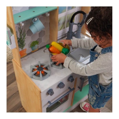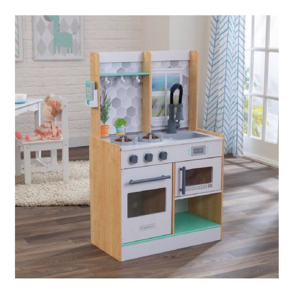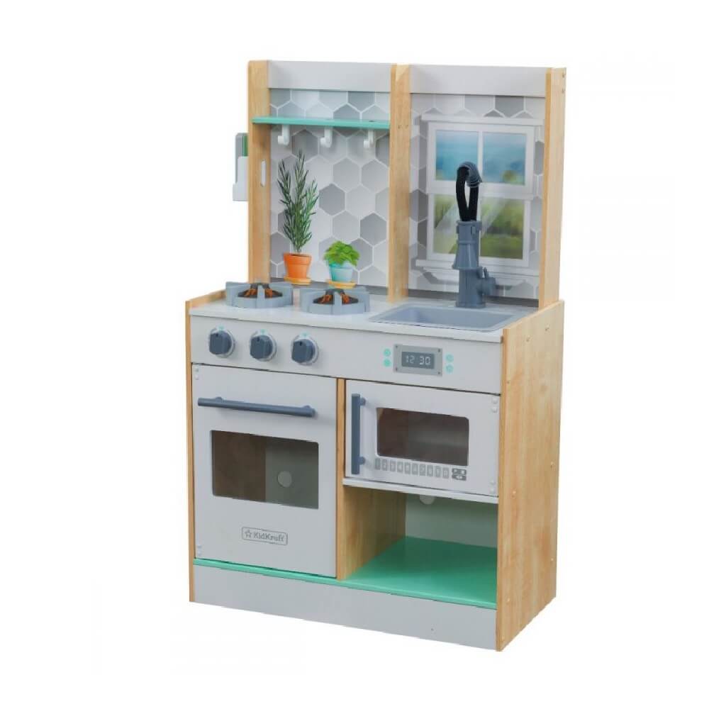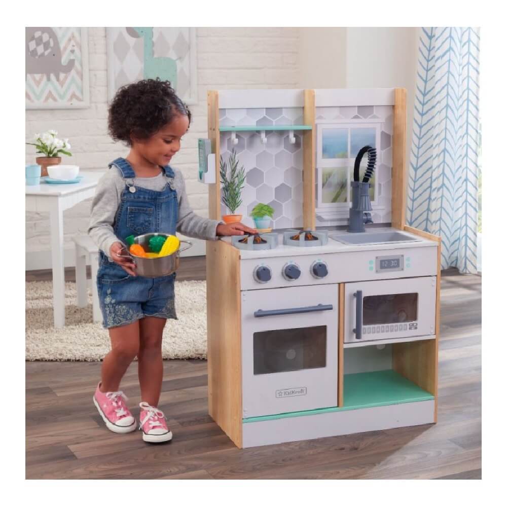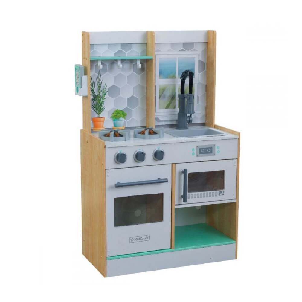 MESTERESTI îți recomandă Bucătărie de lemn copii Natural. Acest produs reprezintă activitatea perfectă pentru cei mici, întrucât vor învăța prin joc și în același timp se vor distra. Bucătăria este fabricată cu grijă și va rezista în timp. Jocul de rol din bucătărie permite crearea unor rețete uimitoare datorită faptului că este dotată cu accesoriile corespunzătoare. Mai mult, aceasta este plină de funcții interactive ce contribuie la un efect real: rotirea butoanelor cuptorului, deschiderea ușilor aparatului, luminile și sunetele. Alege acest joc de bucătărie și creează emoții de neuitat micuților.