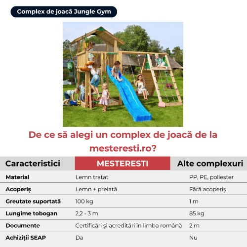 MESTERESTI îți recomandă Loc de joacă Jungle Gym – Mega 6, produsul care asigură distracția pentru copii. Acesta este fabricat cu grijă, conform standardelor și cu materiale calitative ce vor asigura durabilitatea în timp al complexului. Optează pentru acest produs care permite mai multe tipuri de jocuri și posibilități de explorare, iar copii cu siguranță vor fi cei mai fericiți.
