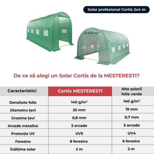 MESTERESTI are pentru tine Solarul de grădină Cortis© 2x4 m, produsul perfect ce te va ajuta să obții culturi sănătoase pe parcursul întregului an, protejând legumele de condițiile meteo nefavorabile, contribuind la creșterea și dezvoltarea armonioasă a acestora. Solarul este realizat din materiale rezistente, de înaltă calitate, durabile, fiind ușor de montat și întreținut. Nu uita că oferim și transport gratuit!