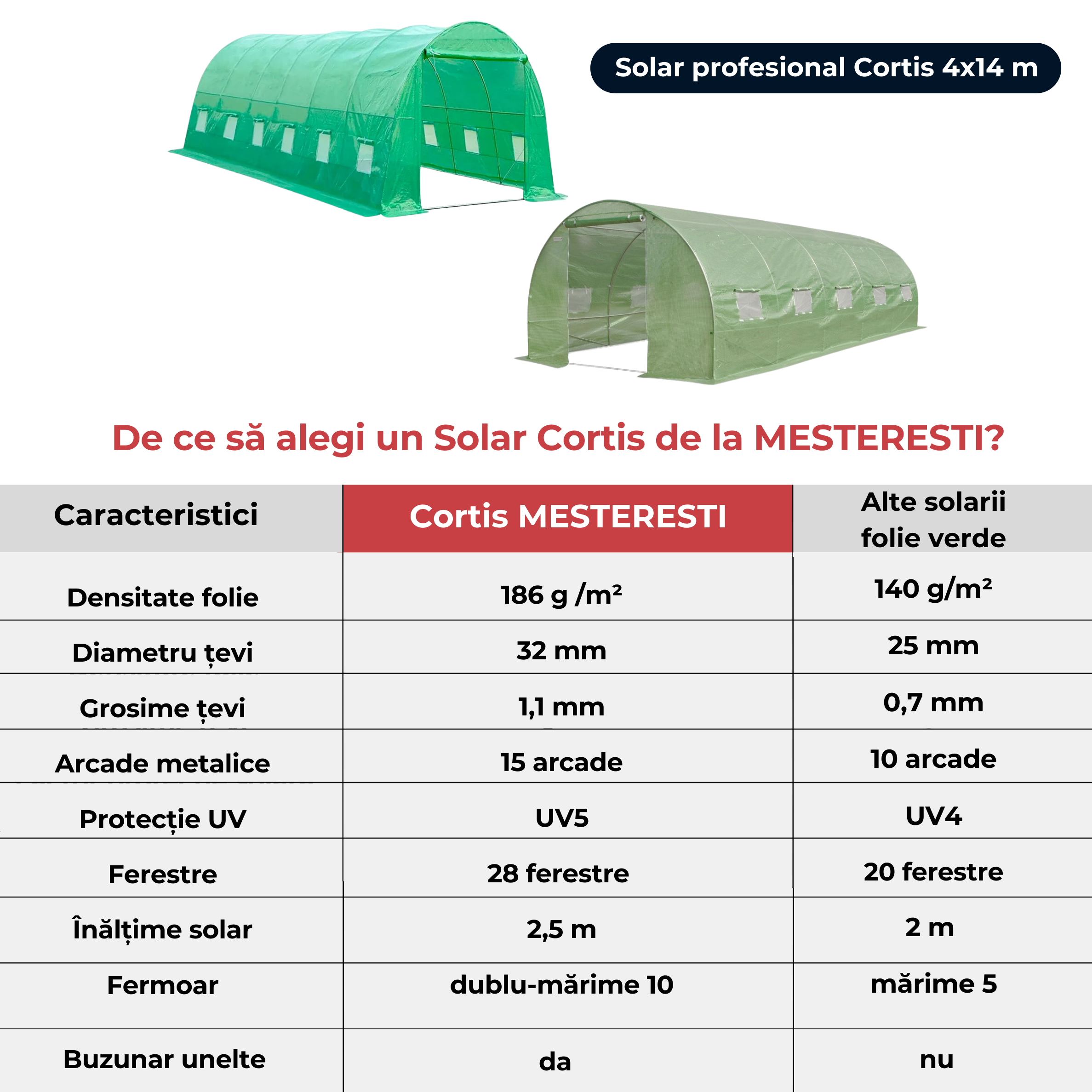 MESTERESTI are pentru tine Solarul de grădină Cortis© 4x14 m, produsul perfect dacă îți dorești să ai legume proaspete și pline de savoare chiar în grădina ta, acesta oferind plantelor un mediu propice pentru dezvoltare și creștere armonioasă, iar datorită materialelor de calitate din care este confecționat, solarul promite rezistență la condițiile meteo extreme. Legumele cultivate în propria grădină vor aduce un plus de savoare preparatelor pe care le vei pregăti, iar în acest fel vei fi sigur de calitatea produselor pe care le folosești. Nu uita că livrăm rapid pentru tine oriunde ai nevoie în România!